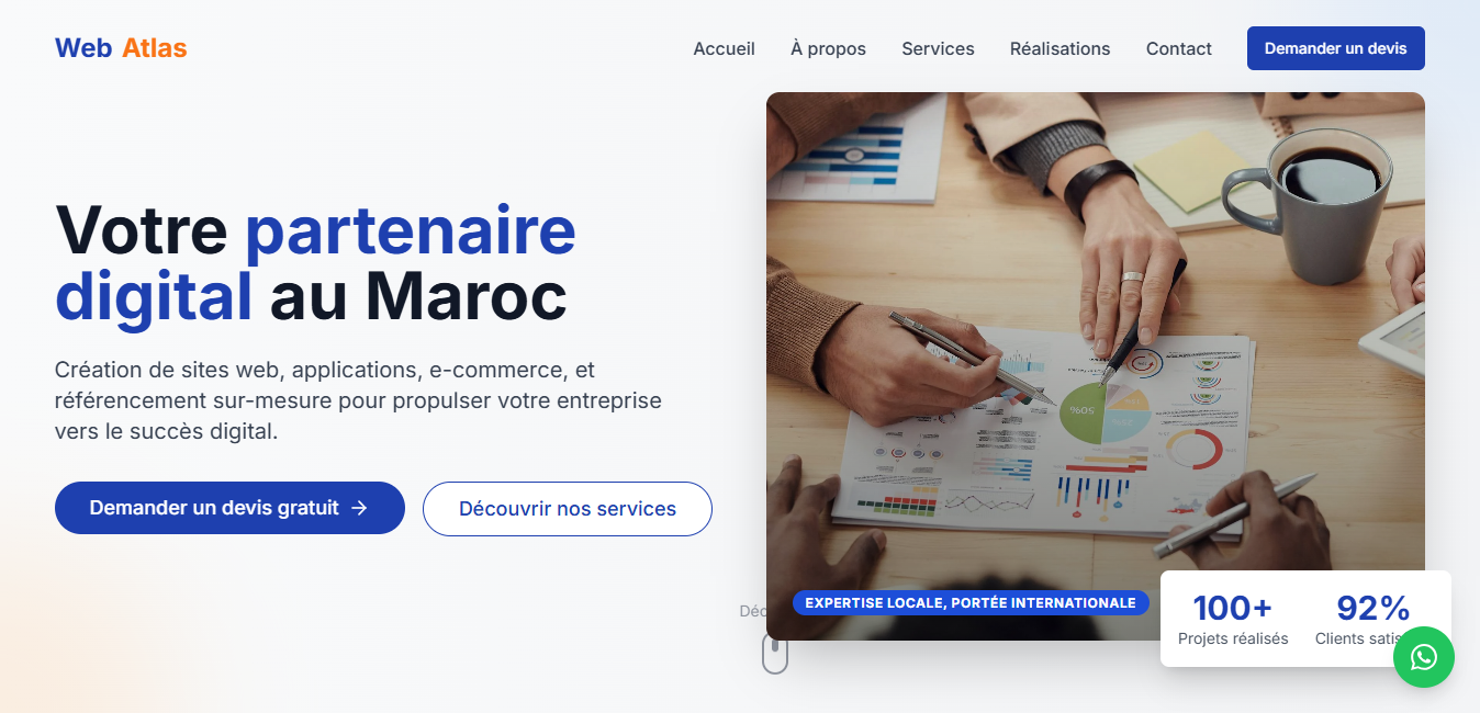 WebAtlas accompagne les agences marocaines et internationales dans leur transformation numérique depuis 2015. Notre équipe d'experts conçoit des solutions digitales personnalisées pour la création de sites web au Maroc, à Casablanca, Rabat, Marrakech, Fès et dans tout le pays.